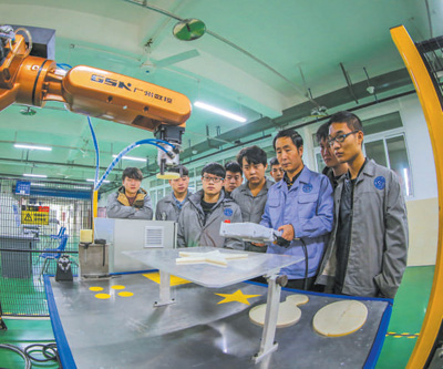 重庆市永川区一家职业院校学生跟着老师在学校实训车间学习机器人手臂操作。