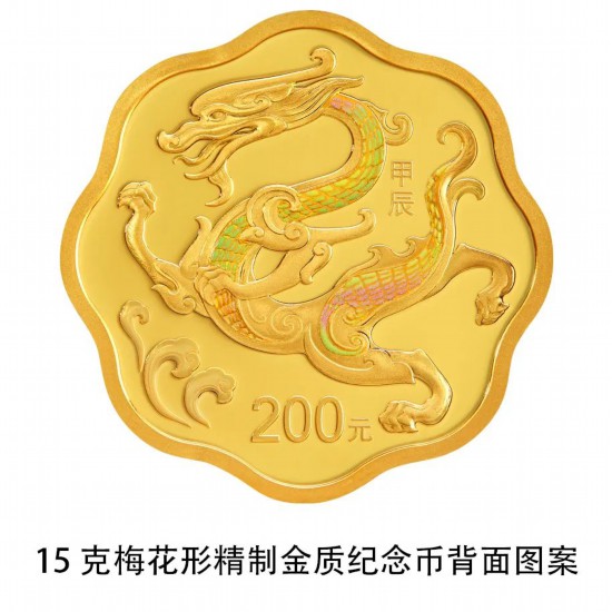 15克梅花形金质纪念币背面图案为龙造型,衬以浪花组合设计。