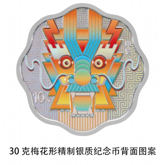 30克梅花形银质纪念币背面图案为装饰龙造型,衬以回纹纹饰。