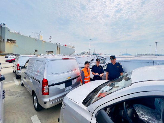 广州海关所属南沙海关关员对出口汽车进行监管。(受访者供图)